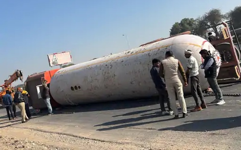 एलपीजी गैस से भरा टैंकर कोटपूतली में पलटा, गैस रिसाब के बाद होटल और ढाबे बन्द कराये, टैंकर को हटाने में लगे 14 घंटे