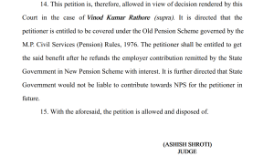 ग्वालियर. हाईकोर्ट ग्वालियर की सिंगल बेंच ने पटवारी भर्ती से जुड़े एक मामले में अहम फैसला सुनाया है। न्यायालय ने स्पष्ट किया है कि 1 जनवरी 2005 से पहले की भर्ती वाले पटवारियों को पुरानी पेंशन योजना फायदा मिलेगा। उन्हें नयी पेंशन योजना के दायरे में नहीं रखा जा सकता है। पटवारी अवधेशसिंह भदोरिया और अन्य ने इस मामले में हाईकोर्ट में याचिका दायर की थी इसमें एडवोकेट आरबीएस तोमर ने तर्क दिया था याचिकाकर्त्ता वर्ष 2003 के पटवारियों भर्ती विज्ञापन के तहत चयनित किया गया था। उनकी ट्रेनिंग और मेडीकल समेत अन्य सभी प्रक्रियायें वर्ष 2004 तक पूर्ण हो चुकी थी। इस प्रकरण में एडवोकेट आरबीएस तोमर न्यायालय के समक्ष तर्क पेश किये गये और हाईकोर्ट ने पटवारियों के पक्ष में फैसला सुनाते हुए कहा है कि 2005 के बाद के पटवारियों को भी पुरानी पेंशन का लाभ दिया जायेगा जिनका चयन 2004 में हुआ था।