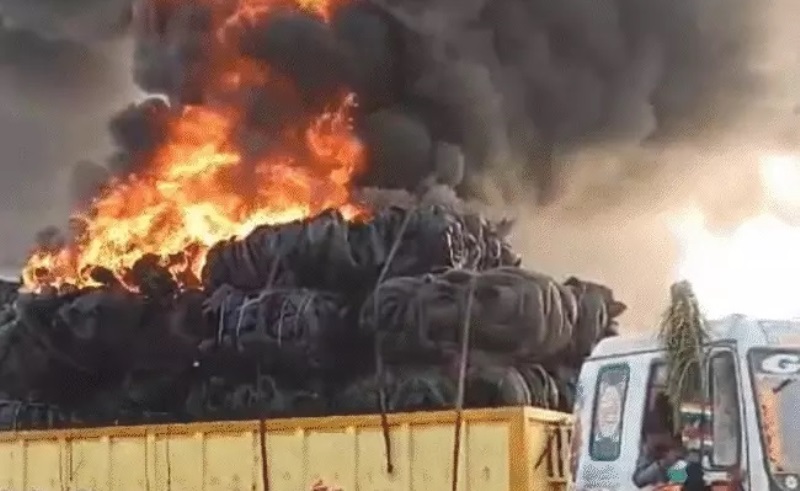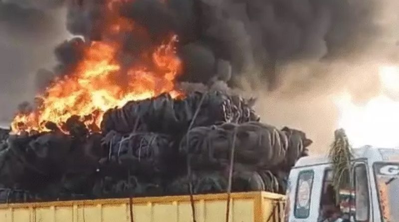 टायरों से भरे कंटेनर में लगी आग, बिजली के तार से टकराने से भड़की लपटें