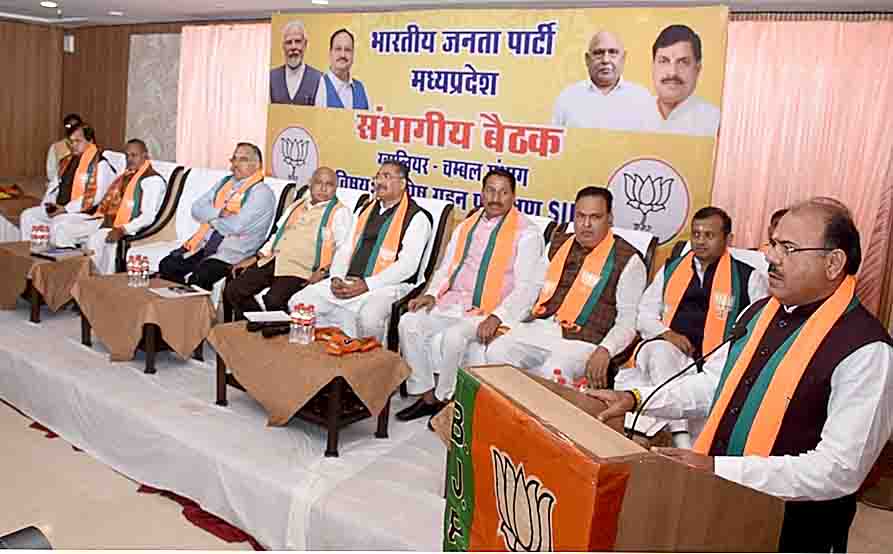 भाजपा के राष्ट्रीय महासचिव एवं एसआईआर के राष्ट्रीय प्रभारी तरूण चुघ, प्रदेश अध्यक्ष व विधायक हेमंत खण्डेलवाल एवं प्रदेश संगठन महामंत्री हितानंद ने ग्वालियर में संभागीय बैठक को किया संबोधित
