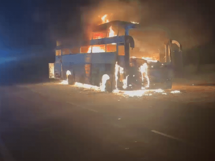 ग्वालियर. सोमवार रात एक यात्री बस में अचानक आग लग गई। बस के टायर से चिंगारी निकलते देख वीडियो कोच बस के चालक ने तुरंत हाईवे किनारे गाड़ी रोककर सभी यात्रियों को सुरक्षित बाहर निकाल लिया। करीब 20 मिनट के भीतर पूरी बस आग की लपटों में घिर गई। घटना के समय बस में 45 यात्री सवार थे। यह बस गुड़गांव (गुरुग्राम), हरियाणा से पन्ना, मध्य प्रदेश की ओर जा रही थी। सूचना मिलने पर पुलिस मौके पर पहुंची और स्थिति को नियंत्रित किया। दमकल दल को भी बुलाकर आग पर काबू पाया गया। राहत की बात यह है कि घटना में कोई जनहानि नहीं हुई।
