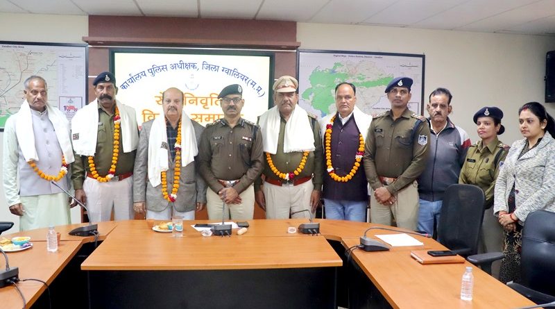 ग्वालियर। वरिष्ठ पुलिस अधीक्षक ग्वालियर धर्मवीर सिंह द्वारा पुलिस विभाग से आज सेवानिवृत हुए 05 पुलिस अधिकारी व कर्मचारियों को विदाई दी गई। इस मौके पर आरआई रणजीत सिंह, सूबेदार स्मृति दौहरे, मुख्य लिपिक नरेन्द्र तुनिया सहित कार्यालयीन स्टाफ एवं सेवानिवृत हुए पुलिस अधिकारी एवं कर्मचारी व उनके परिजन उपस्थित रहे। पुलिस कन्ट्रोल रूम ग्वालियर सभागार में पुलिस सेवा से सेवानिवृत्त हो रहे 05 पुलिस अधिकारी व कर्मचारियों के लिये विदाई समारोह का आयोजन किया गया। जिसमें वरिष्ठ पुलिस अधीक्षक ग्वालियर द्वारा पुलिस विभाग से सेवानिवृत्त हो रहे पुलिस अधिकारी व कर्मचारियों को प्रमाण पत्र, स्मृति चिन्ह देकर विदाई दी गई। वरिष्ठ पुलिस अधीक्षक ग्वालियर ने सेवानिवृत्त पुलिसकर्मियों से नौकरी के दौरान उनके अनुभवों को भी साझा किया।