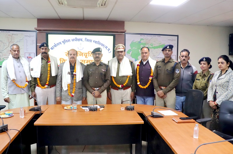 इस अवसर पर सेवानिवृत्त हुए पुलिसकर्मियों से उनके भविष्य के कार्यकलापों के बारे में जाना तथा उनको सेवानिवृत्त उपरांत स्वयं को सामाजिक कार्यो में व्यस्त करने की सलाह दी जिससे अभी तक रही व्यस्तता की दिनचर्या से बाहर निकलने में मदद मिलेगी। कार्यक्रम के समापन पर वरिष्ठ पुलिस अधीक्षक ग्वालियर ने आज सेवानिवृत्त हो रहे पुलिस कर्मियों को प्रमाण पत्र व स्मृति चिन्ह देकर उनके बेहतर स्वास्थ्य व उज्जवल भविष्य की कामना की। वरिष्ठ पुलिस अधीक्षक ग्वालियर द्वारा सेवानिवृत्त हो रहे सभी अधिकारी एवं कर्मचारियों से उनकी सेवाकाल के दौरान किये गये कार्यो की जानकारी ली गई।