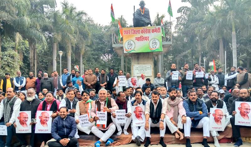 ग्वालियर – महात्मा गांधी राष्ट्रीय ग्रामीण रोजगार गारंटी योजना (मनरेगा) भारत के करोड़ों गरीब, मजदूर एवं श्रमिक वर्ग की जीवन रक्षा का सबसे मजबूत हथियार है। 2005 में यूपीए सरकार द्वारा शुरू की गई यह योजना हर ग्रामीण परिवार को सालाना 100 दिनों का गारंटीड रोजगार देती है, जो भूखमरी, बेरोजगारी और प्रवासन की मार से बचाती है। आजादी के 78 वर्ष बाद भी हमारे गांवों में लाखों परिवार संघर्ष कर रहे हैं, और मनरेगा ने उन्हें नई उम्मीद दी है। लेकिन केंद्र की भाजपा मोदी सरकार इस योजना को विकसित भारत ग्रामीण रोजगार गारंटी विधेयक (बीबी-जी राम जी बिल) 2025 नाम देकर बदलने की साजिश रच रही है। यह नाम बदलना महज दिखावा है असल में यह योजना को कमजोर करने का षड्यंत्र है। जिसे कांग्रेस पार्टी कतई बर्दाश्त नहीं करेगी, जिसके विरोध में कंाग्रेस अध्यक्ष सुरेन्द्र यादव के नेतृत्व में शहर जिला कांग्रेस कमेटी द्वारा फूलबाग स्थित गांधी उद्यान में महात्मा गांधी जी की प्रतिमा के नीचे धरना देकर पुरजोर विरोध प्रदर्शन किया गया।
