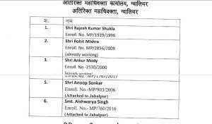 नए शासकीय अधिवक्ताओं में रवींद्र दीक्षित, गिर्राज किशोर अग्रवाल, बृजमोहन पटेल, शैलेन्द्र कुशवाह, कौशलेंद्र तोमर, दिनेश सविता, योगेश पारासर, सोहित मिश्रा, संजय कुशवाह, मोहित शिवहरे, दिलीप अवस्थी, रिकेश गोयल, चंद्रप्रताप सिंह कुशवाह, विक्रम पिप्पल, धर्मेंद्र नायक, मनीष सक्सेना, सतेंद्र सिकरवार, प्रभात पटेरिया, अनिल बाबू मंगल, बृजेश त्यागी, अंजली जानानी, राजेंद्र जैन, मिराज कुरैशी और सार्थक रायजादा को नियुक्त किया गया है।