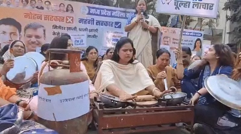 भोपाल. विधानसभा सत्र के बीच महिला कांग्रेस ने मंगलवार को भोपाल में महंगाई के विरोध में प्रदर्शन किया। महिला कांग्रेस की प्रदेशाध्यक्ष रीना बोसी सेठिया की अगुआई में महिला कार्यकर्ताओं ने प्रदेश कांग्रेस कार्यालय के बाहर बैठकर थाली बजाई और रोटिया बेली। कार्यकर्ताओं ने खाली कड़ाही, चकला, बेलन और गैस सिलेंडर लेकर यह संदेश दिया है कि मंहगाई की वजह महिलायें परेशान है। हालत यह है कि रसौई का बजट गड़बड़ा गया है। दालें, अनाज, तेल समेत अन्य खाद्य सामग्री महंगी हो गयी है। गरीब लोग गैस सिलेंडर नहीं भरवा पा रहेे है।