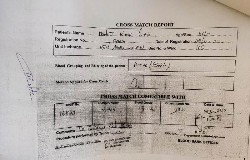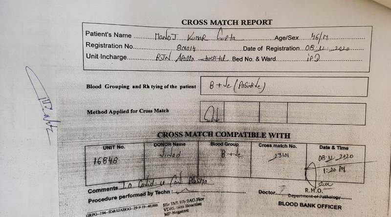 प्लाज्मा वाले मामले में जो पर्ची हमें दिखाई गई है वह ब्लड बैंक से जारी नहीं हुई है और यह फर्जी पर्ची है। संभवतः किसी ने हमारी पर्ची की फोटो कॉपी करके नकली पर्ची निकलवाई है। हमारे यहां पर प्लाज्मा की कोई एंट्री नहीं है साथ ही त्यागी नाम का कोई भी व्यक्ति हमारे यहां पर काम नहीं करता है।