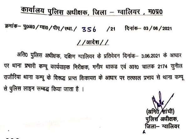 इस मामले में पुलिस कप्तान ने जांच का जिम्मा एएसपी शहर दक्षिण हितिका वासल को सौंपा था और उनकी जांच व सिफारिस के आधार पर एसपी ग्वालियर ने गुरूवार रात को टीआई मनीष धाकड़, सिपाही सुनील राजौरिया को तत्काल प्रभाव से लाइन अटैच करने के आदेश जारी कर दिए।