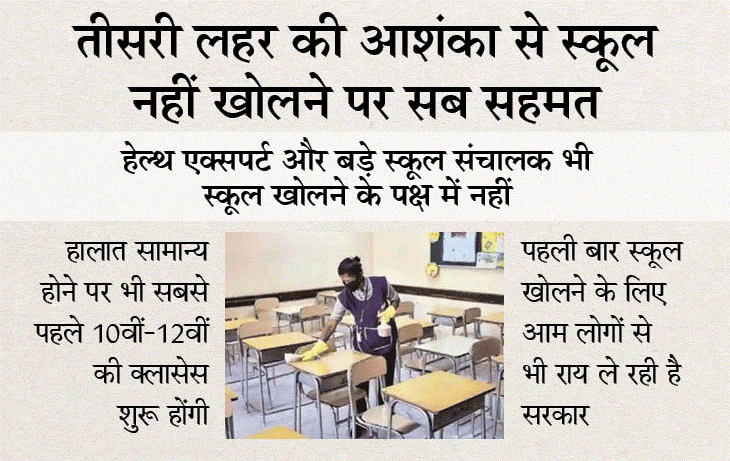 भोपाल. कोरोना की तीसरी लहर की आशंका को देखते हुए मप्र में अगस्त के पहले सरकारी-प्राइवेट स्कूल खुलने के आसार नहीं है। तीसरी लहर नहीं आई और हालात सामान्य रहे तो ही अगस्त में स्कूल खोले जा सकेंगे। इसे लेकर सरकार ने स्कूल संचालक, एक्सपर्ट से बात की जिसमें समान रूप से यही निकलकर आया कि जुलाई आखिरी तक स्कूल नहीं खोले जाने चाहिए। वैसे मंत्री समूह अपनी रिपोर्ट तीन दिन में तैयार कर लेगा। शिवराज सरकार इस पर गंभीरता से विचार कर रही है कि जुलाई अंत तक कोई स्कूल न खोले जाएं। वैसे भी अब किसी तरह की परीक्षा का दबाव भी नहीं है और सभी तरह के स्कूलों में 15 जून से एडमिशन देने के साथ ऑनलाइन कक्षाएं फिर से चालू करने की अनुमति देने के पीछे भी यही कारण है।
