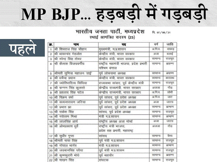 8 जून को रात करीब 10.30 बजे भाजपा के मीडिया प्रभारी लोकेंद्र पाराशर ने कार्यकारिणी की एक लिस्ट जारी कर दी। इसके बाहर आते ही हंगामा मच गया। इसमें कार्यसमिति के सदस्यों के नाम के आगे उनकी जाति का कॉलम भी रखा गया था। लिस्ट बाहर आते ही कांग्रेस ने जातियों का जिक्र होने पर तंज कसे। हलचल भाजपा में भी हुई।