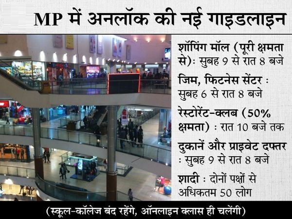 भोपाल. मध्य प्रदेश सरकार ने अनलॉक की नई गाइडलाइन जारी कर दी है इसके तहत छूट का दायरा बढ़ा दिया गया है। अब शॉपिंग मॉल के साथ जिम, रेस्टोरेंट, क्लब, फिटनेस सेंटर और खेल स्टेडियम को भी खोलने की इजाजत दे दी गई है और सभी तरह की दुकानें, प्रतिष्ठान और प्राइवेट ऑफिस पूरी क्षमता के साथ सुबह 9 बजे से रात 8 बजे तक खुल सकेंगे।