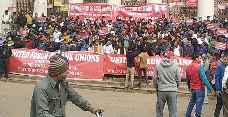 ग्वालियर में निजीकरण के विरोध में सरकारी बैंकों में लटके रहे ताले, 1000 कर्मियों ने फूलबाग शाखा पर प्रदर्शन किया