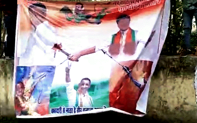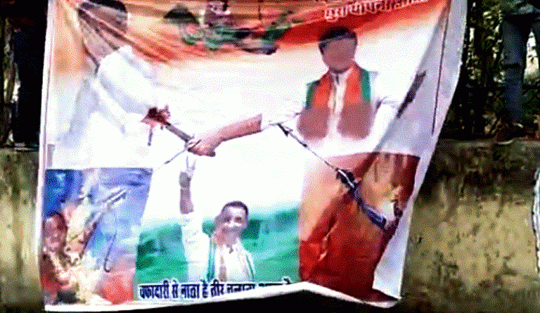 ग्वालियर में सिंधिया के महल के सामने कमलनाथ की पीठ में छुरा मारते पोस्टर लगाया