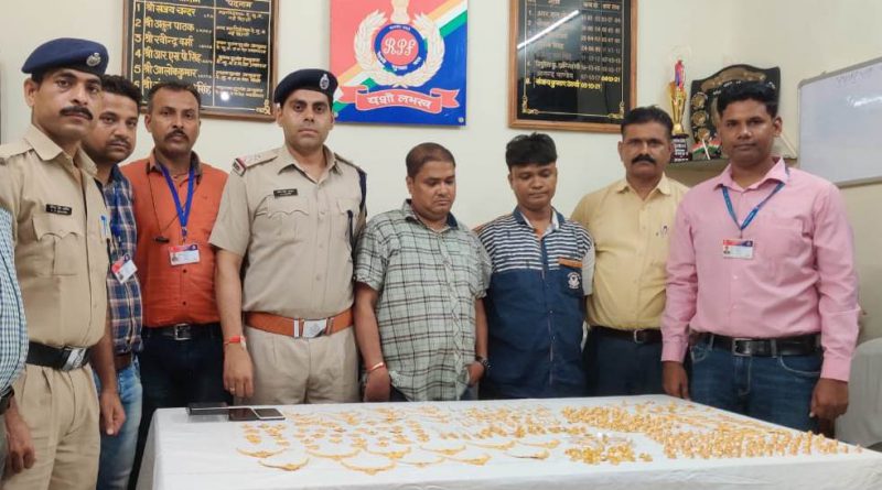जीआरपी थाना प्रभारी एसआई प्रमोद पाटिल ने बताया गुरूवार की रात आरपीएफ और जीआरपी के जवान जब प्लेटफॉर्म नम्बर 2 पर गश्त कर रहे थे, तभी भोपाल से खबर मिली कि दो युवक काले रंग का बड़ा बैग लेकर मुंह पर मास्क लगाकर सोने के आभूषण के साथ शताब्दी एक्सप्रेस से ग्वालियर से दिल्ली की ओर जाने वाले हैं पुलिस स्क्वॉड ने पुराने आरओबी के पास जवानों को तैनात कर दोनों युवकों पर नजर रखना शुरू कर दिया।