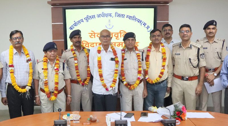 ग्वालियर। पुलिस विभाग से सेवानिवृत हुए पुलिस अधिकारी व कर्मचारियों को भावभीनी विदाई दी गई। इस अवसर पर पुलिस अधीक्षक के साथ रक्षित निरीक्षक सत्य प्रकाष मिश्रा, सूबेदार अजय राजावत सहित समस्त कार्यालयीन स्टाफ उपस्थित रहा।