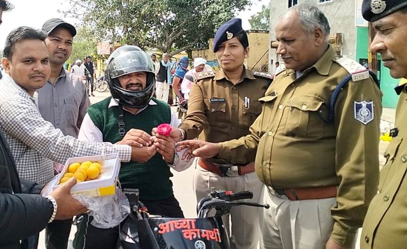 हेलमेट का उपयोग कर रहे दुपहिया वाहन चालकों को खिलाई मिठाई और गुलाब के फूल भेंट किए