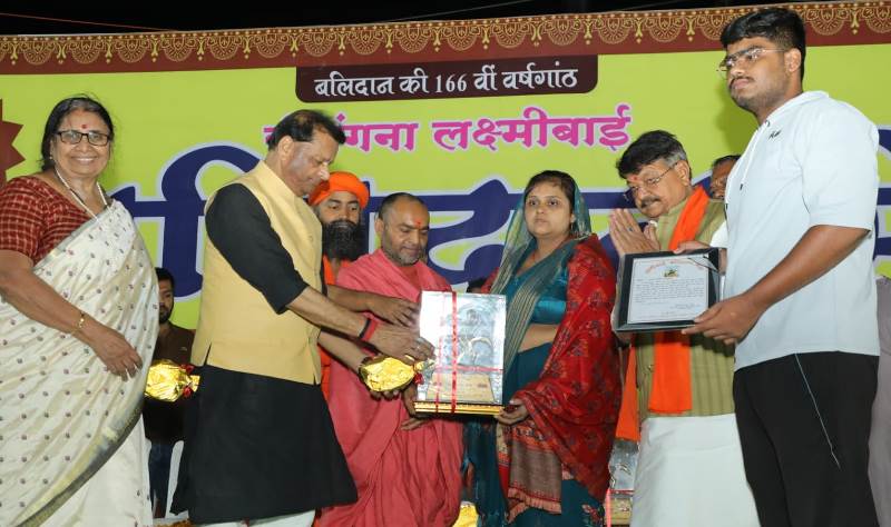 ग्वालियर = वीरांगना लक्ष्मीबाई बलिदान मेला आयोजन समिति द्वारा इस वर्ष आयोजित हुए 25वे बलिदान मेले में महान क्रांतिकारी अमर शहीद चन्द्रशेखर आजाद के सहयोगी क्रांतिकारी श्री रूद्रनारायण के प्रपौत्र श्री गौरव नारायण को सम्मानित किया गया। साथ ही मातृ शक्ति की राष्ट्रीय प्रमुख सुश्री मीनाक्षी ताई विशवे को वीरांगना सम्मान प्रदान किया गया। देश की रक्षा के लिए अदम्य साहस का परिचय देकर अपने प्राणों की आहुति देने वाले चंबल के शहीद सतेन्द्र सिंह राजावत के परिजन को भी इस अवसर पर सम्मानित किया गया। प्रदेश के नगरीय विकास व आवास एवं संसदीय कार्य मंत्री व कार्यक्रम के मुख्य अतिथि कैलाश विजयवर्गीय, महामण्डलेश्वर संत उत्तम स्वामी जी, उद्यानिकी एवं खाद्य प्रसंस्करण मंत्री नारायण सिंह कुशवाह, बलिदान मेले के संस्थापक अध्यक्ष एवं पूर्व मंत्री श्री जयभान सिंह पवैया एवं अन्य अतिथियों ने इन सभी को सम्मान प्रदान किए।