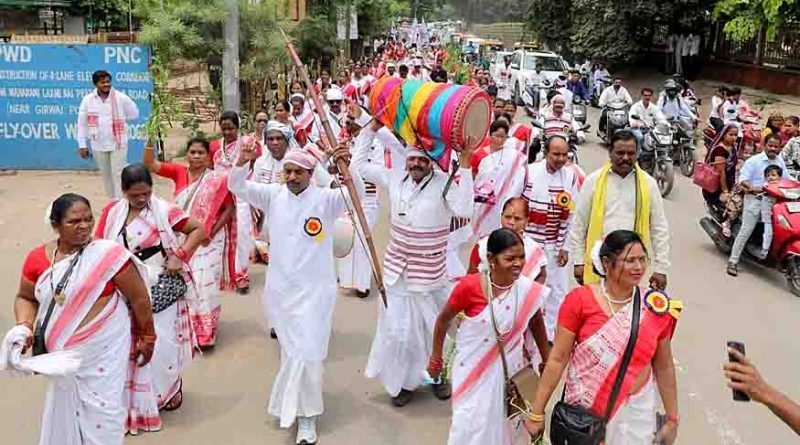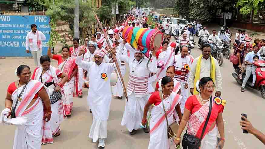 विश्व आदिवासी दिवस पर पारंपरिक वेशभूषा में निकला चल समारोह