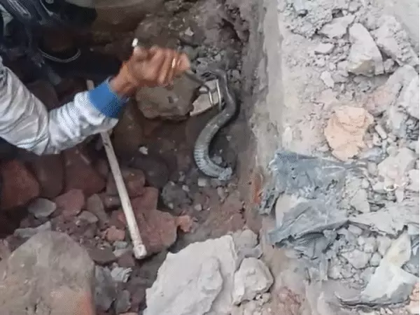 महेंद्र ने वहां एक व्यक्ति का गमछा लेकर कोबरा को पकड़ने का प्रयास किया। इस दौरान कोबरा वहां से निकलने की कोशिश करता रहा, लेकिन फंसे होने के कारण बाहर नहीं आ पाया। महेंद्र ने जैसे-तैसे सांप का मुंह पकड़ा और पत्थर-मिट्टी हटाकर उसे बाहर निकाला। बाहर निकालने के बाद देखा कि उसकी त्वचा पर कुछ घाव थे। फिर उसे पानी से साफ किया गया।